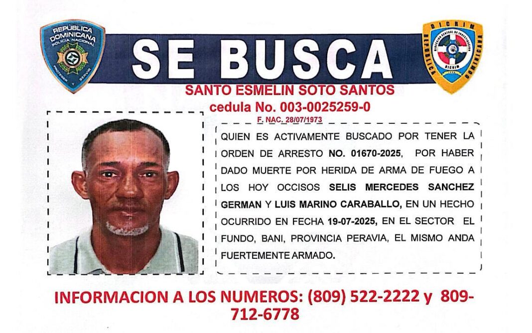 Soto Santos era activamente buscado por ser el presunto autor de la muerte de su expareja, Selis Mercedes Sánchez Germán, y de Luis Marino Caraballo, hecho ocurrido el pasado 19 de julio de 2025 en la comunidad de El Fundo, Baní.