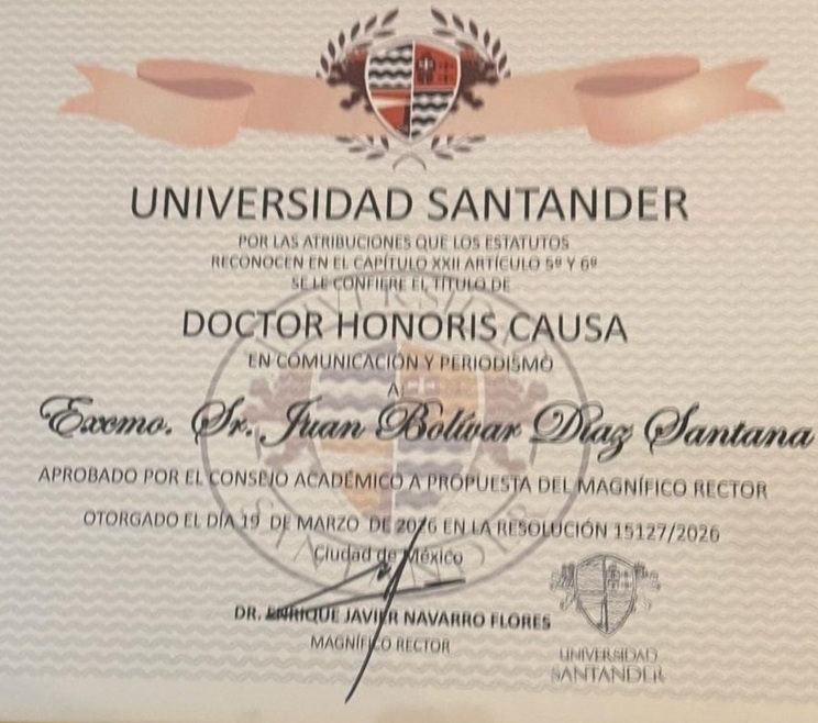 Ciudad de México.- La Universidad Santander, a través de su rector, el Dr. Enrique Javier Navarro Flores en una solemne ceremonia entregó al periodista dominicano Sr. Juan Bolívar Díaz Santana el título DOCTOR HONORIS CAUSA.